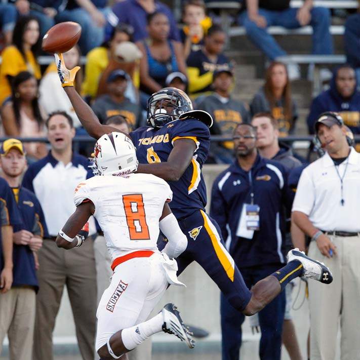 Toledo wide receiver Alonzo Russell, back, leaps for a pass against Bowling Green cornerback Cameron Truss.