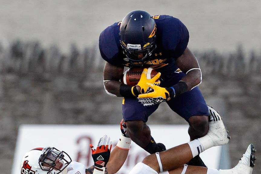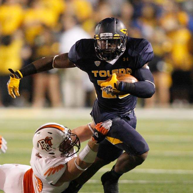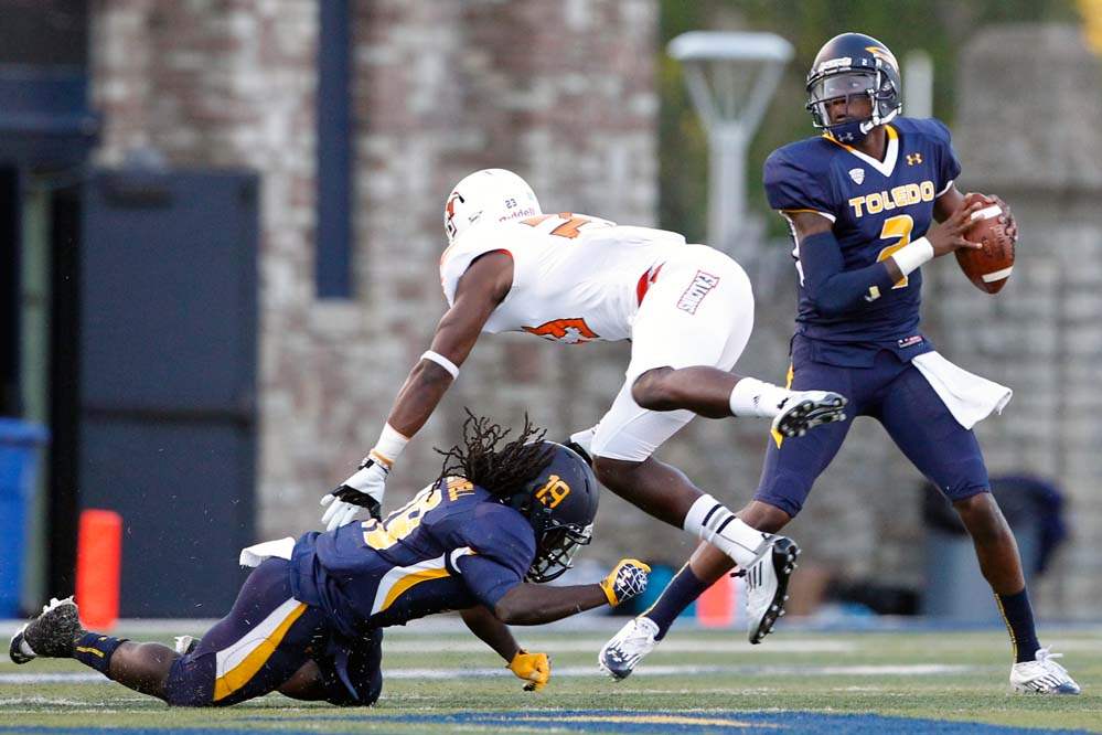 Toledo running back David Fluellen leaps over Bowling Green defender Ryland Ward.