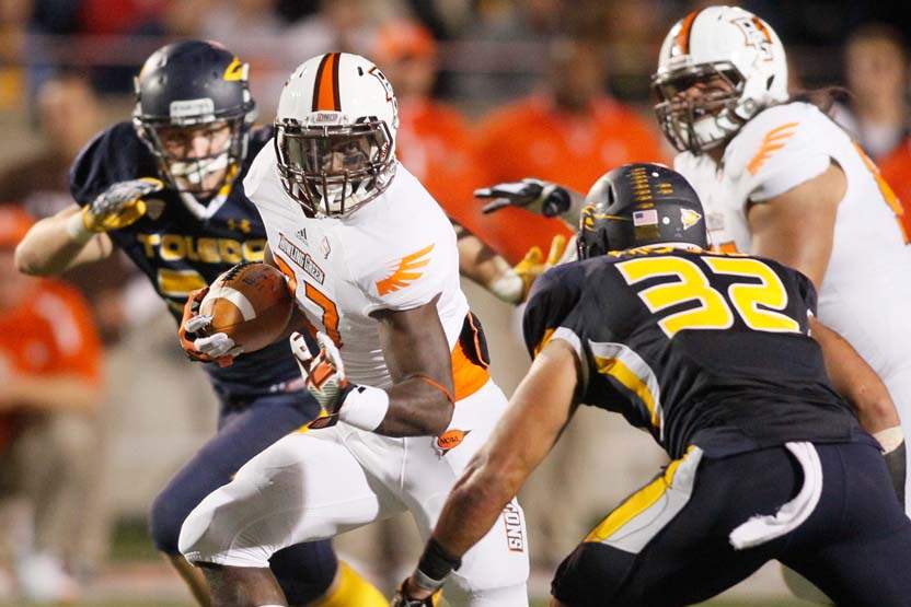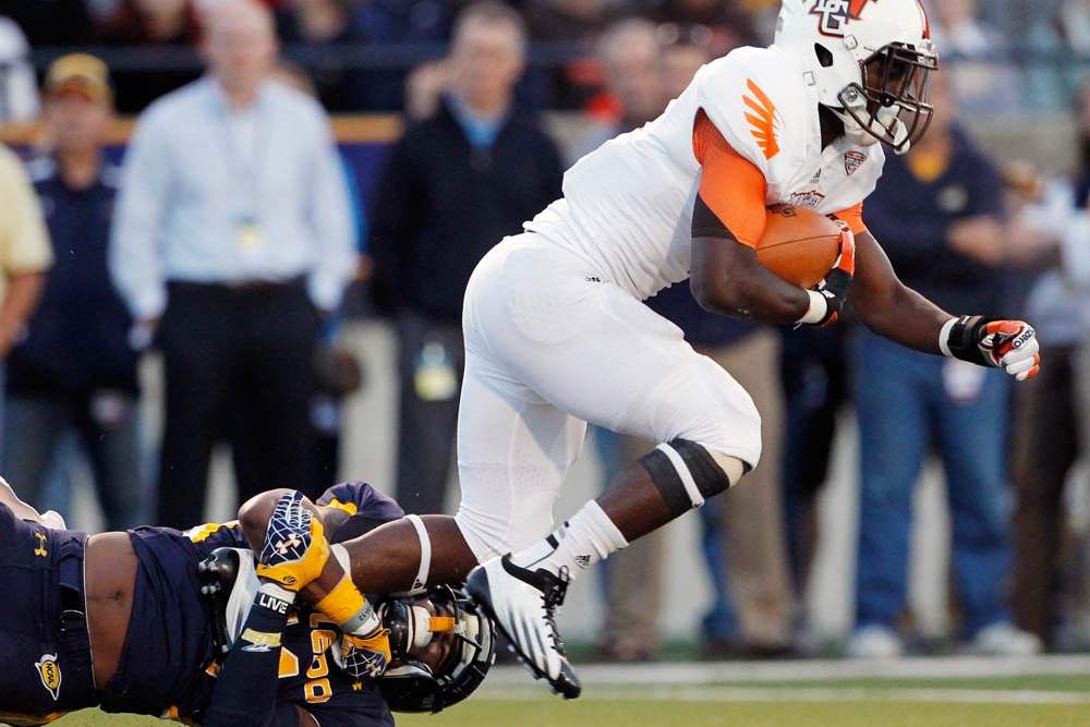 Bowling Green running back Anthon Samuel leaps for extra yards against Toledo.