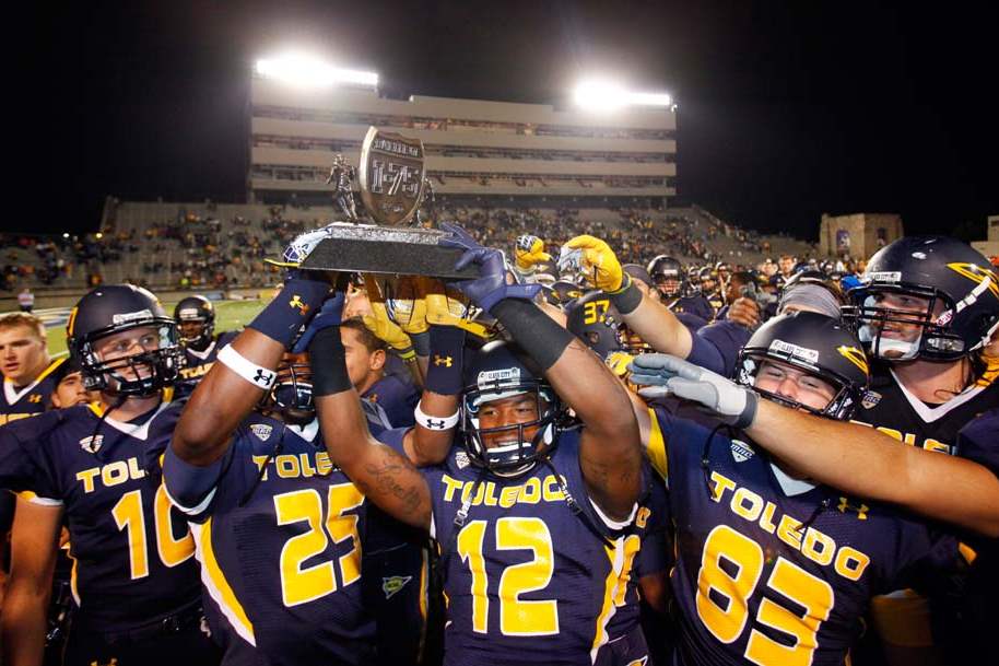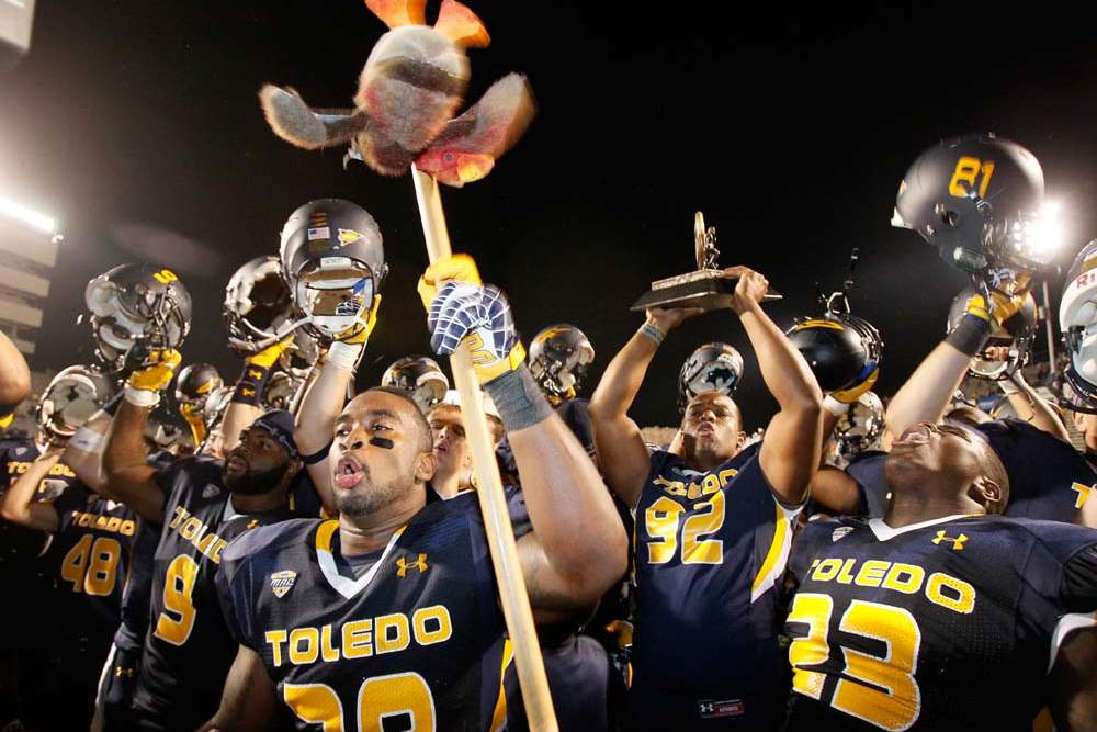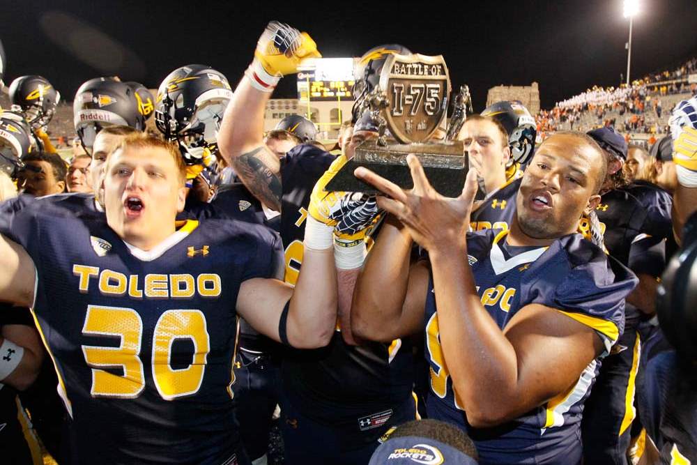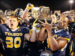 Toledo players including Ben Pike, left, and Danny Farr, right, hold trophy after beating Bowling Green.
