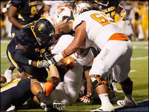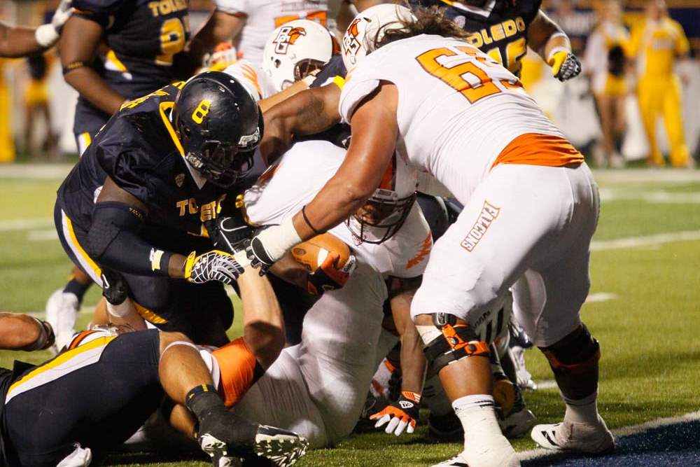 Bowling Green running back John Pettigrow pushes his way toward the goal line as Toledo defensive lineman Elijah Jones, 8, tries to stop him.