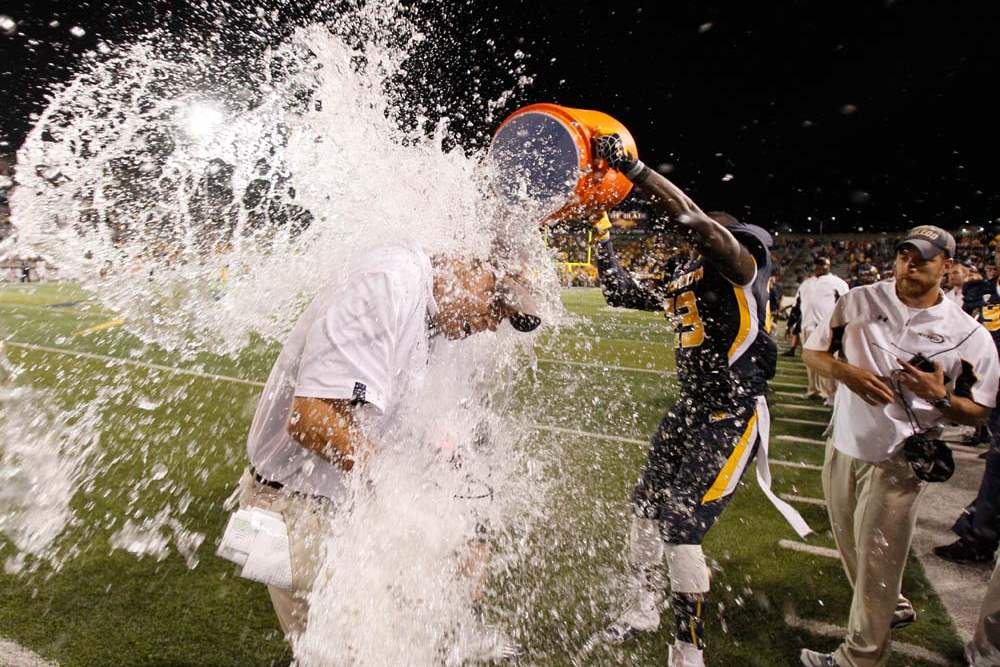 Toledo football coach Matt Campbell is doused with water by T.J. Fatinikun, 23, after the Rockets won.