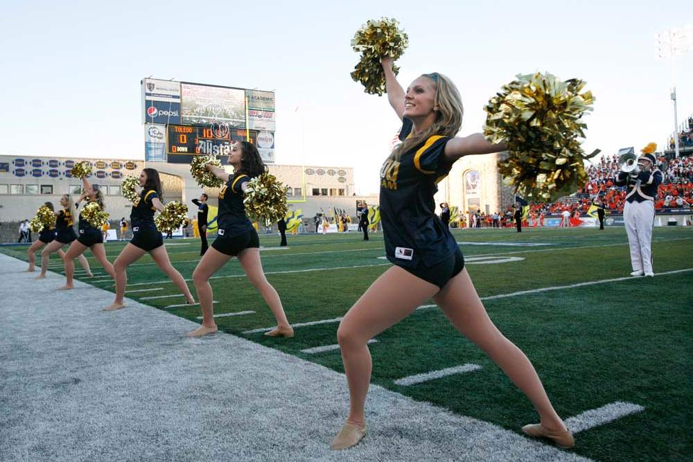 Toledo students try to grab a free T-shirt being thrown by cheerleaders.