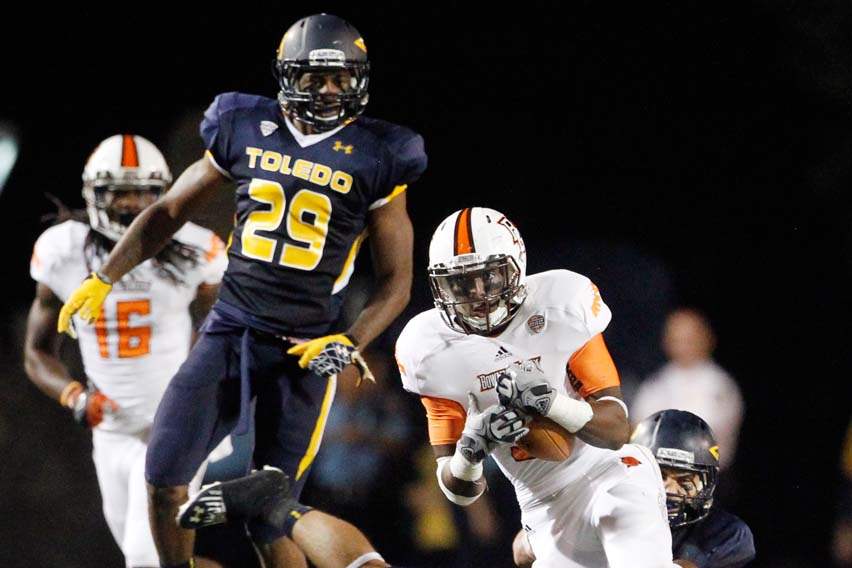 Bowling Green running back Jamel Martin picks up yardage as he is pursued by Toledo linebacker Dan Molls.