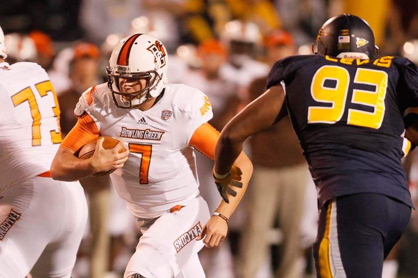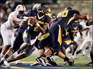 University of Toledo quarterback Terrance Owens is pursued by BowlingGreen defensive back Aaron Foster during the second quarter of their football game at the Glass Bowl in Toledo.