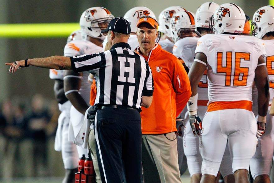 Bowling Green head coach Dave Clawson argues a call with an official.