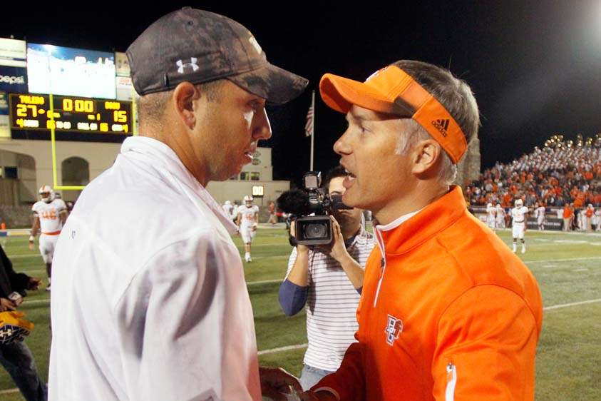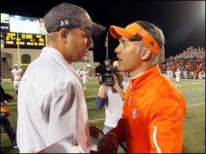 Toledo coach Matt Campbell, left, and Bowling Green coach Dave Clawson meet after the Rockets beat the Falcons 27-15.