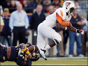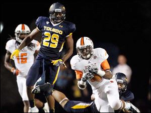 Toledo wide receiver Bernard Reedy is brought down by Bowling Green defenders Victor Osborne, 34, and Dwayne Woods, 5, during the first quarter of their football game at the Glass Bowl in Toledo.