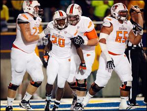 Toledo running back David Fluellen scores a touchdown during the second quarter of the Rockets' football game against Bowling Green at the Glass Bowl in Toledo.