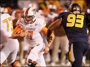 Bowling Green quarterback Matt Schilz, left, runs for a first down as Toledo defensive lineman Phil Lewis moves in during the third quarte.