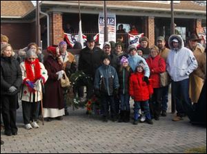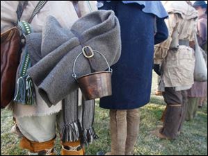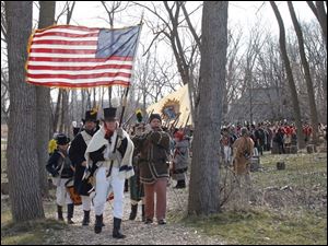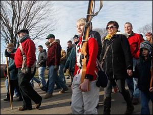 About 300 re-enactors march from the Sawyer Homestead to the River Raisin National Battlefield Park Visitor Center.