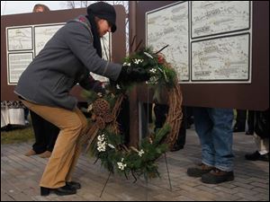Kalamazoo resident Alma Moore-Egen, a descendant of the Navarre family, lays a wreath at the River Raisin National Battlefield Park Visitor Center.