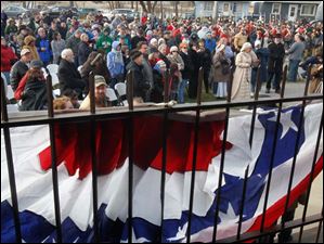 A large crowd gathers at the River Raisin National Battlefield Park Visitor Center to watch the proceedings.