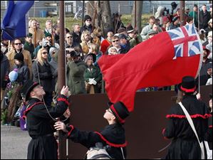 Flag bearers raise the British flag during the 200th anniversary of the Battles of the River Raisin at the River Raisin Battlefield Park.