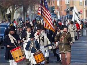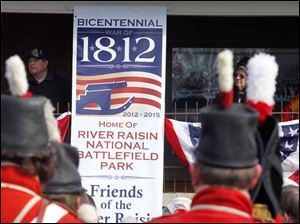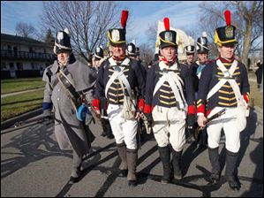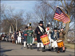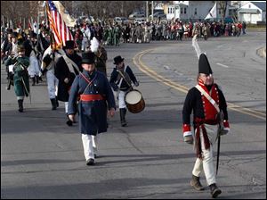 Many reenactment units gather and march down East Front Street to the River Raisin National Battlefield Park Visitor Center during the 200th anniversary of the Battles of the River Raisin in Monroe, Mich.