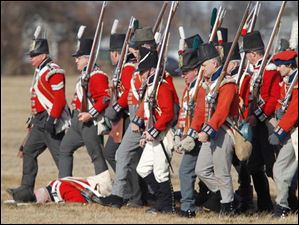 British soldiers fight the Americans during the tactical demonstration at the Monroe Multi-Sports Complex in Monroe, Mich.