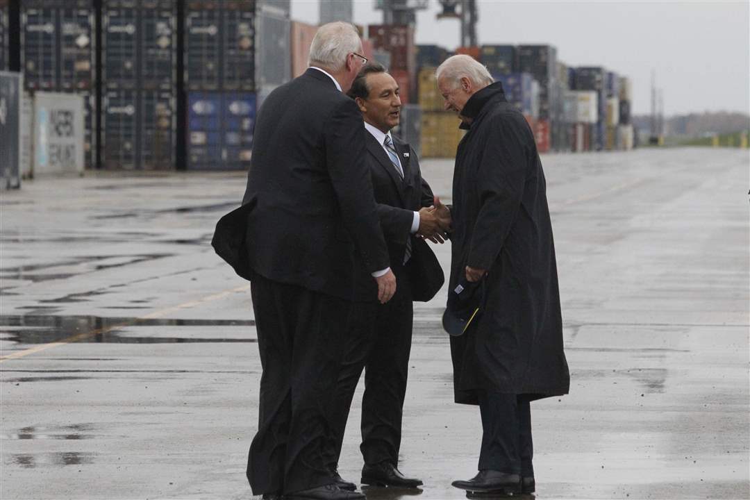 Vice President Joe Biden, right, is greeted by Mr. Oscar Munoz, Chief Operating Officer and Executive Vice President of CSX Corporation, center, and Wilby Whitt, CSX Intermodal Terminals Inc. president, right.