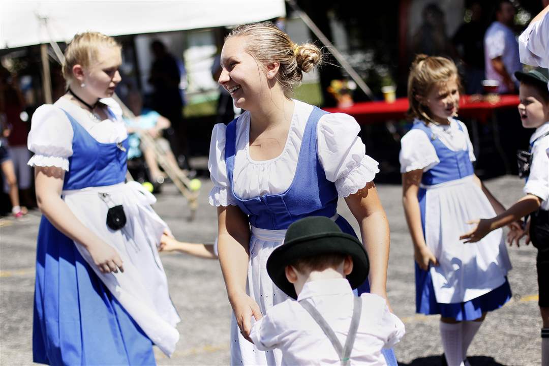 Mia Raymond, 17, laughs while performing with her 5-year-old partner Bill Weber, both of the Toledo Holzhacker Baum, during the festival.