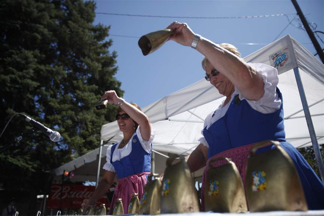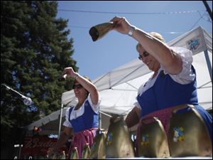 Patty Mowly and Jackie Beutler, of the Toledo Holzhacker Buam, perform their bell tunes.