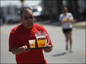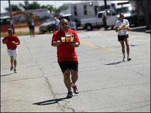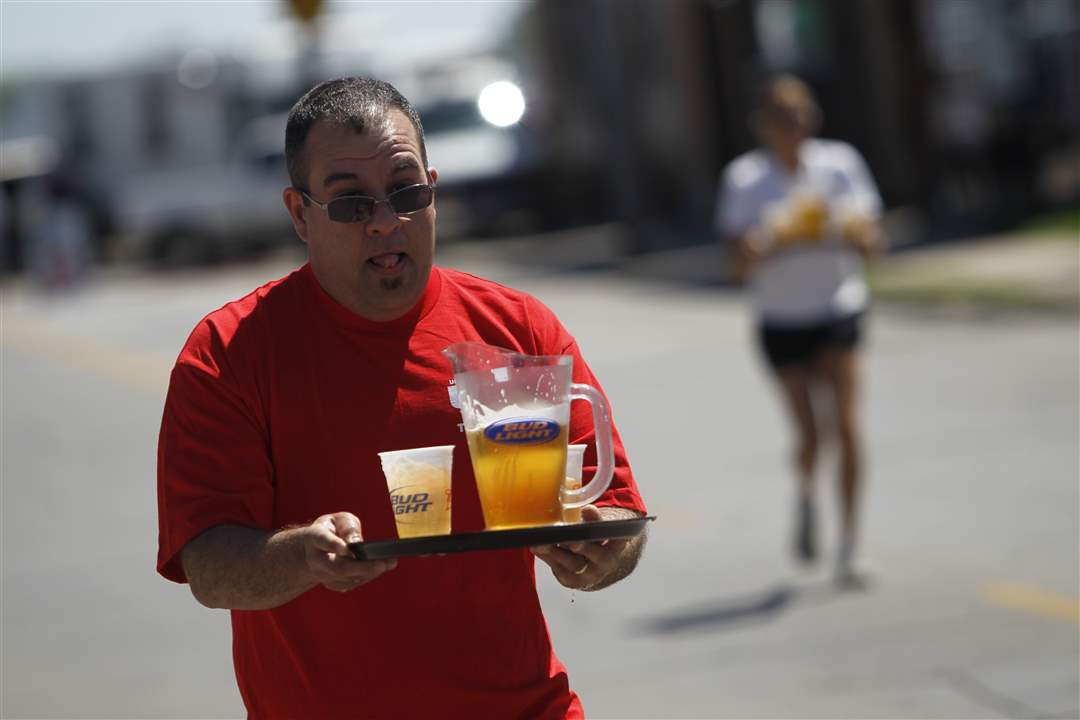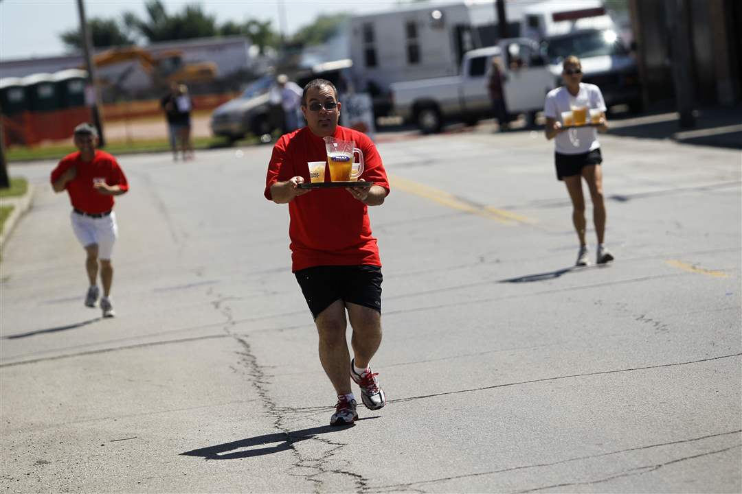 Tim Marshall, of the United Steelworkers Local 912, runs the third leg of the waiters' race during the festival. Although the United Steelworkers won in the speed category, they placed third due to their lack of beer remaining at the finish line.