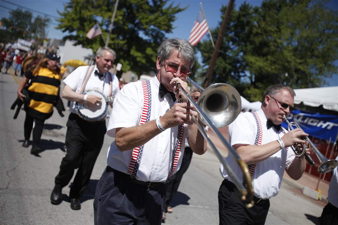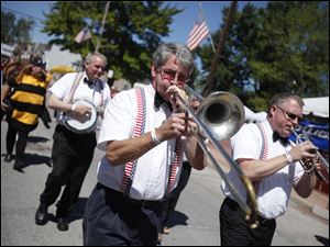 Tromboneist Russ Damshroder, of the Cakewalkin' Jass Band lead the parade in honor of the 80th anniversary of Tony Packo's Cafe.