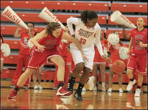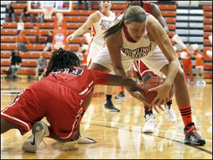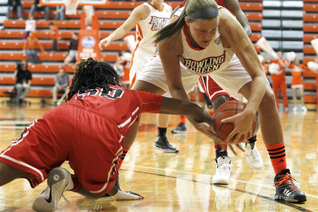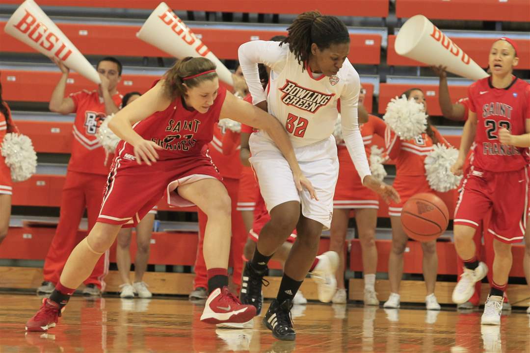 SFU's Samiah Bethel, left, and BGSU's Jill Stein compete for a loose ball.