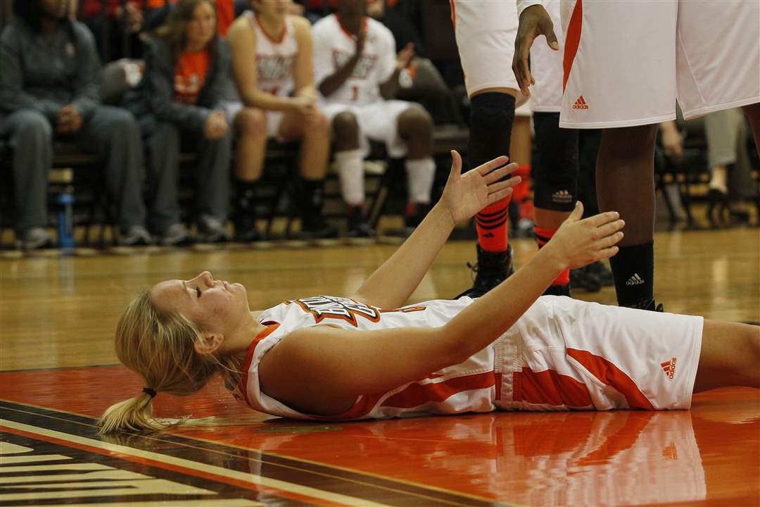 BGSU's Jillian Halfhill looks toward the referee after being called for a foul. Helping her up is teammate Jasmine Matthews. At left is teammate Deborah Hoekstra.