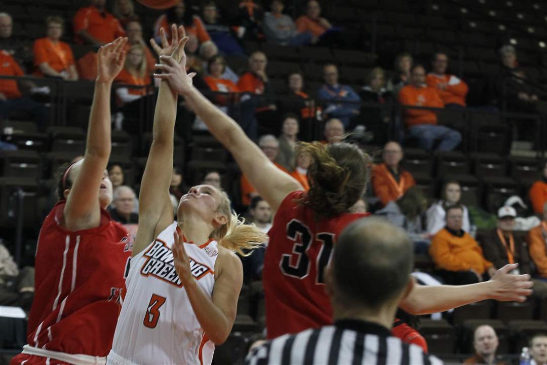 BGSU's Erica Donovan, who scored a game-high 22 points, shoots between SFU's Alli WIlliams and Rebecca Keegan.