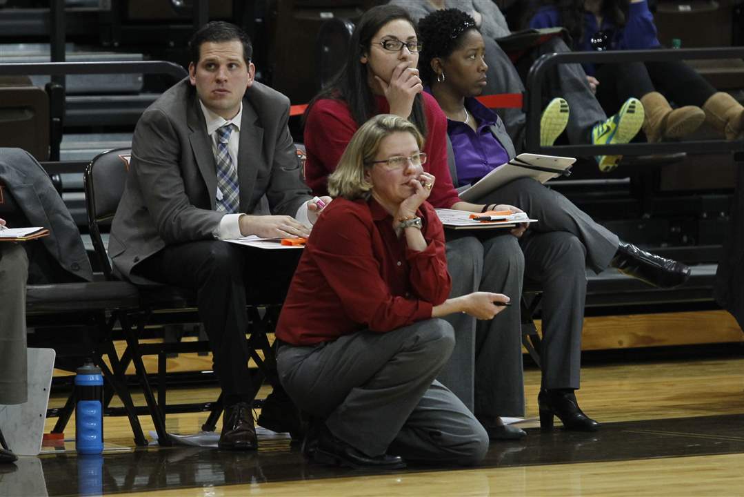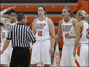 BGSU's Jill Stein, second from right, reacts to a foul called against her in the second half. With her are teammates, from left, Deborah Hoekstra, Erica Donovan, and Abby Siefker.