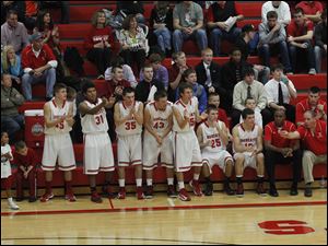 The BG bench celebrates a 3-pointer.