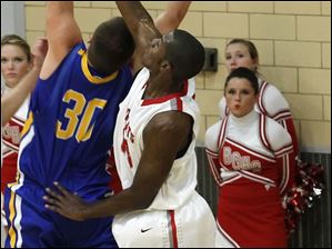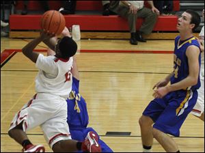 Findlay's Grant Niswander tries to block shot of BG's LaMonta' Stone.