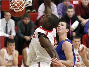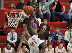 BG's Vitto Brown towers over Findlay's Grant Niswander as he tips in a teammate's missed shot.