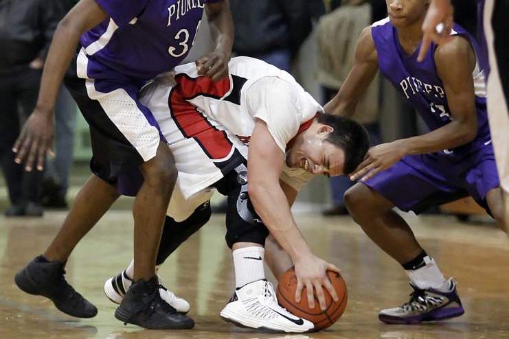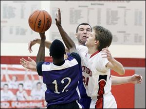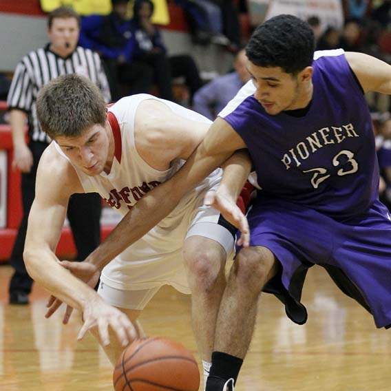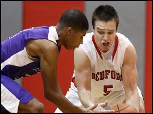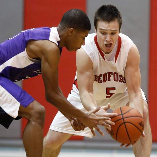 Bedford's Bradley Boss (5) steals the ball from Ann Arbor Pioneer's Duane Simpson-Redmond (3) in Bedford, Michigan. Bedford defeated Ann Arbor 56-54.