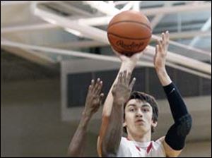 Bedford's Reed Nagley (34) takes a shot against Ann Arbor Pioneer's Jibreel Hussein (23) and Forrest Neal (34).