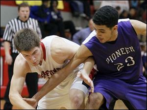 Bedford's Adam Swisher (15) battles Ann Arbor Pioneer's Jibreeal Hussein (23).