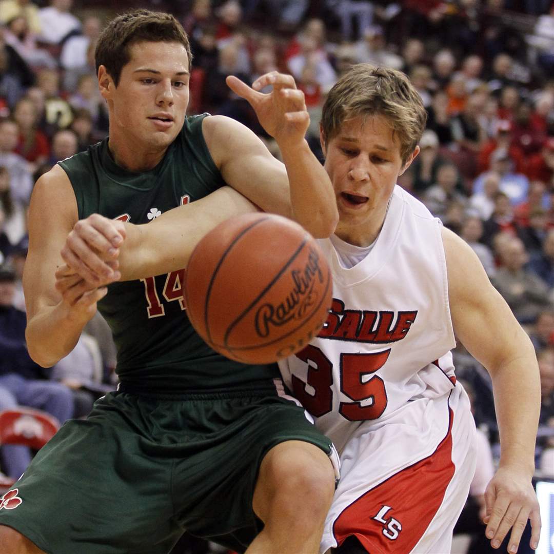 Central Catholic's Jay Marquette (14) battles Cincinnati LaSalle's Joe Burger (35) for the ball.