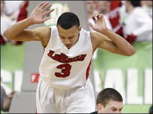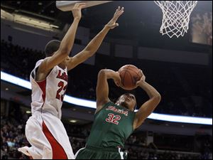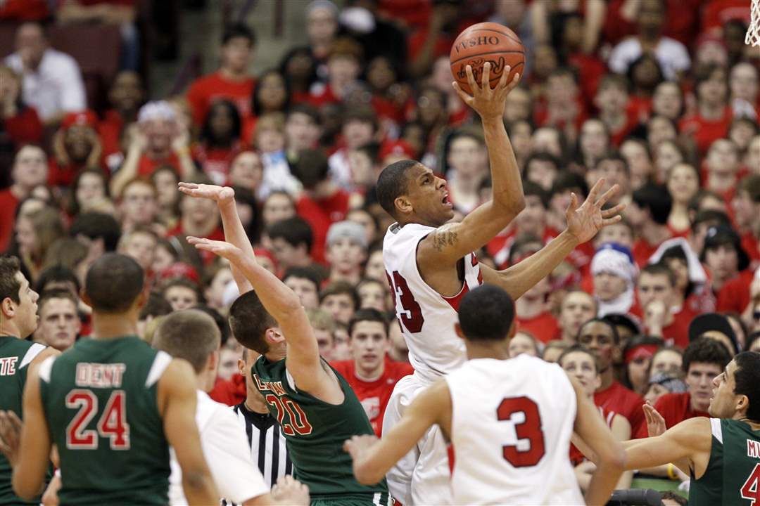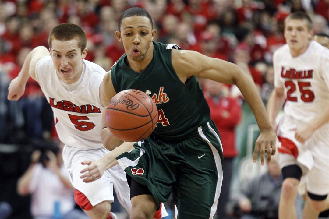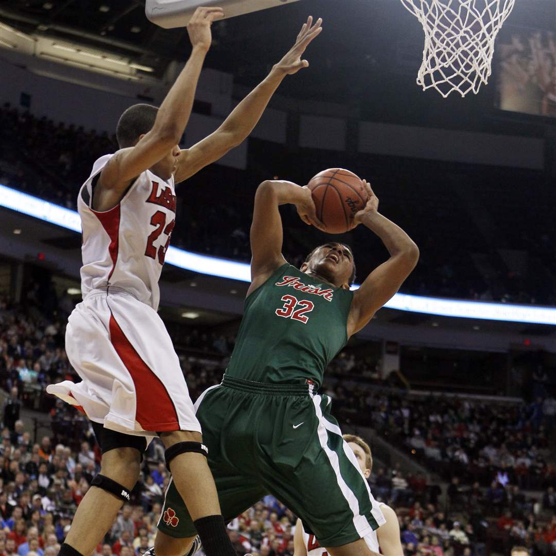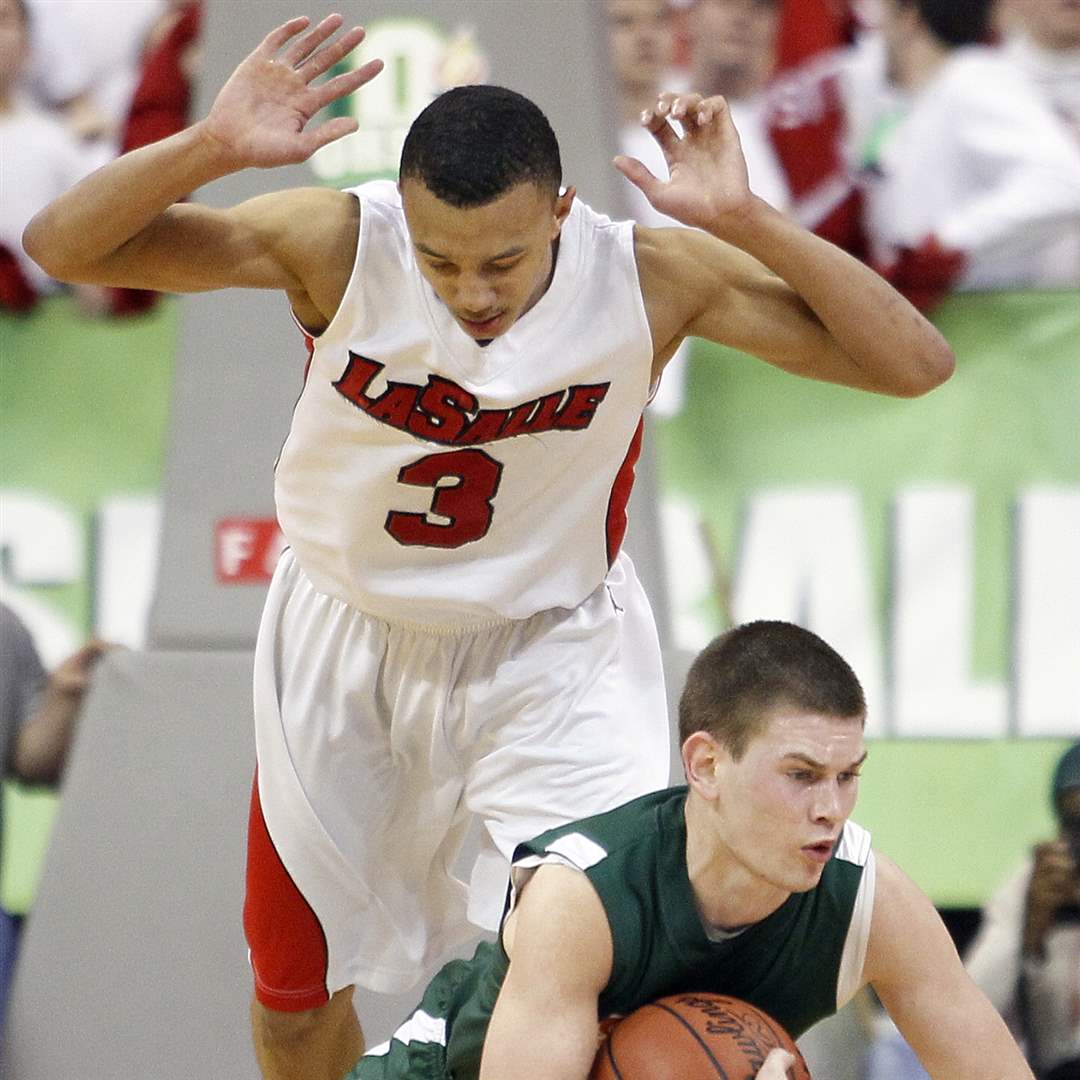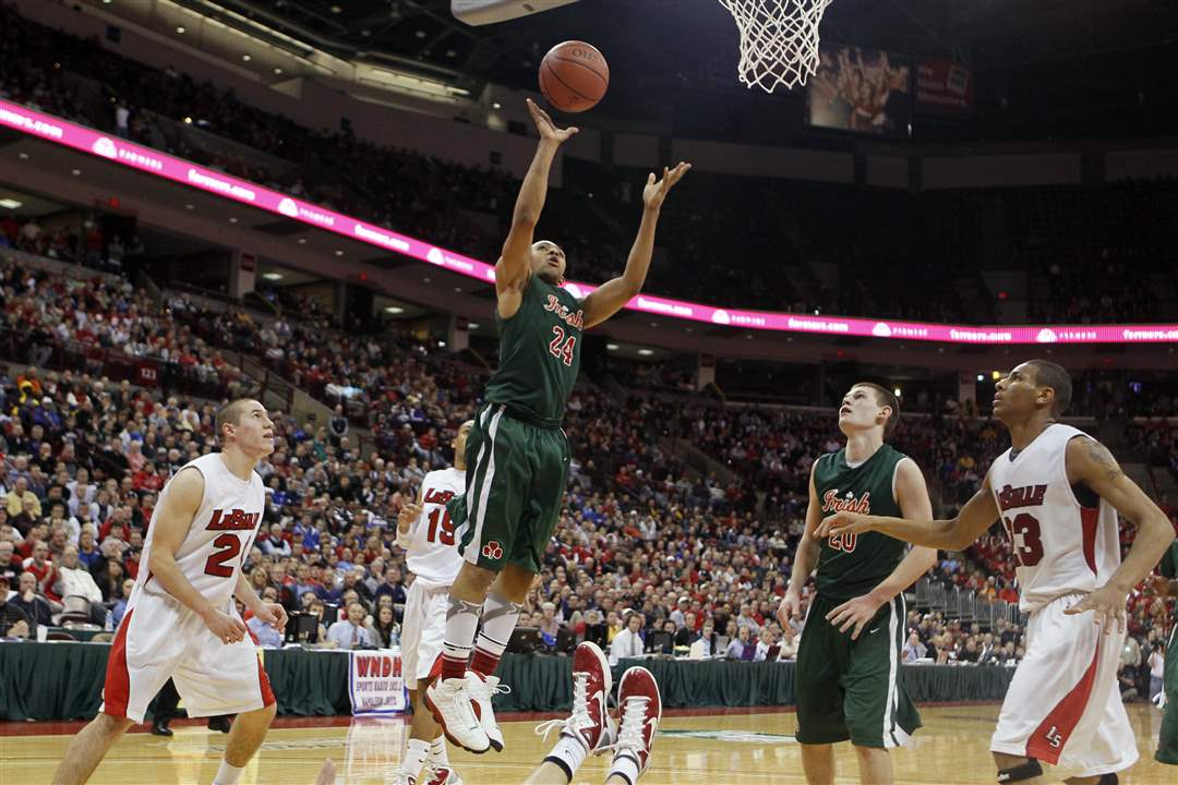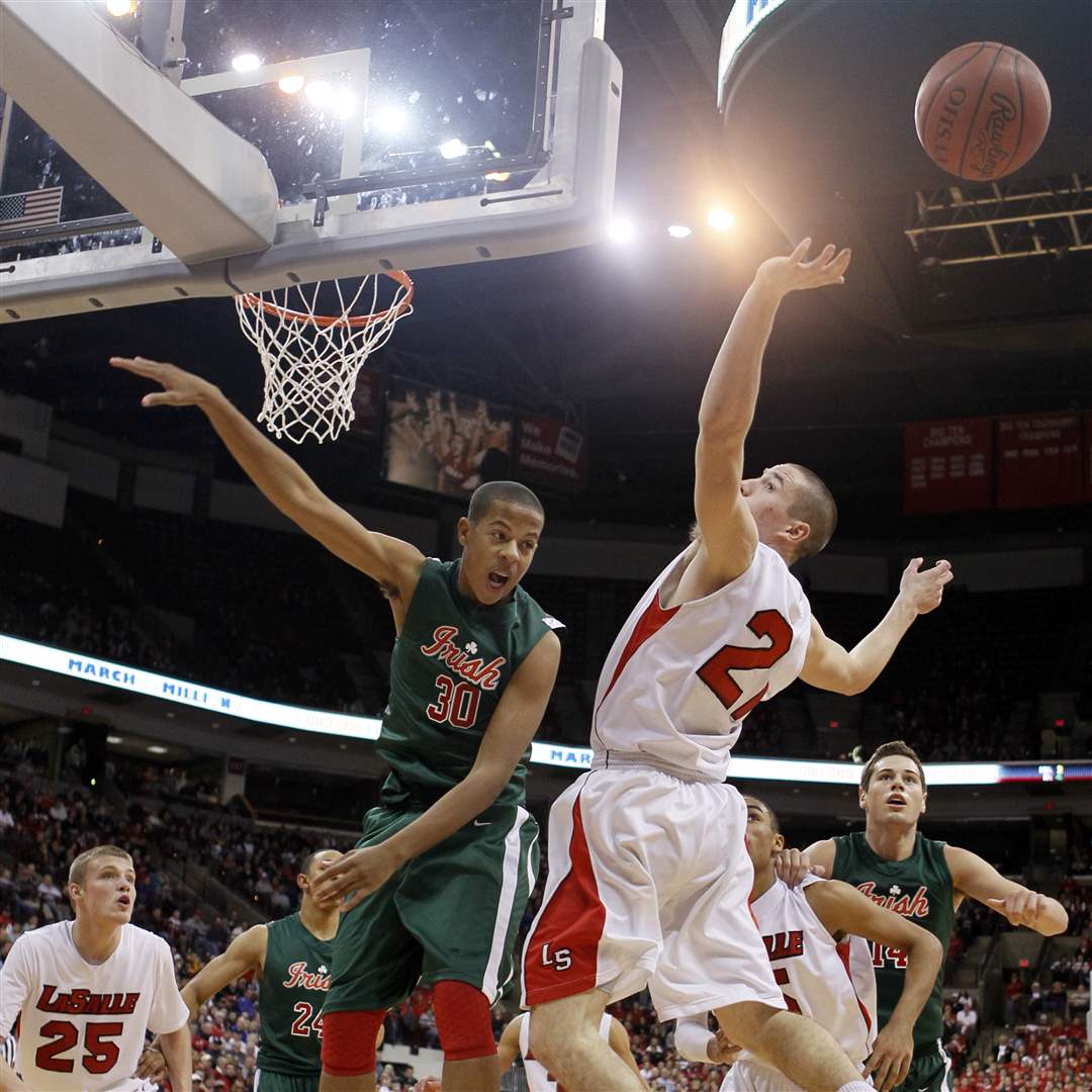 Central Catholic's Deshone Kizer (32) goes to the net against Cincinnati LaSalle's Brandon Neel (23).