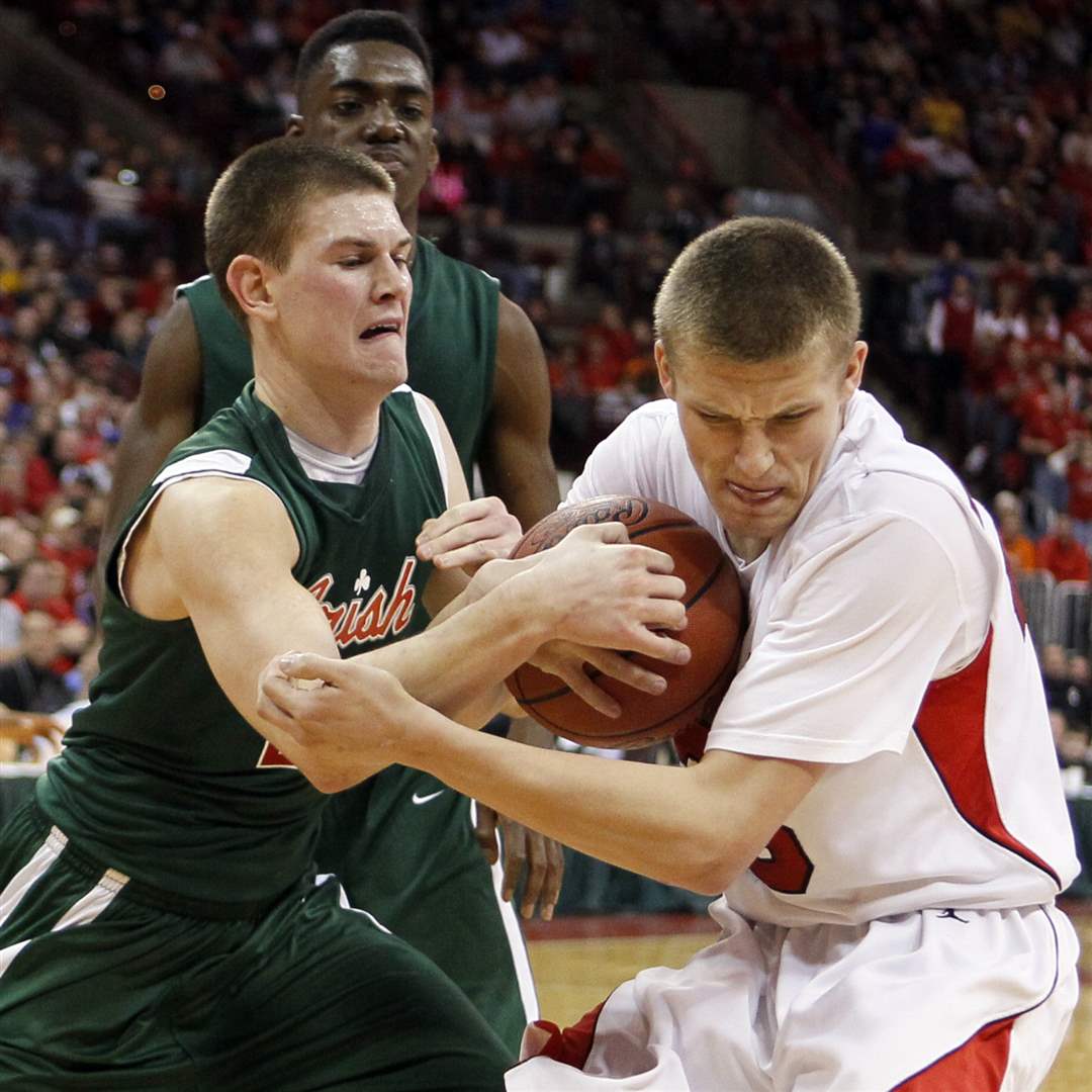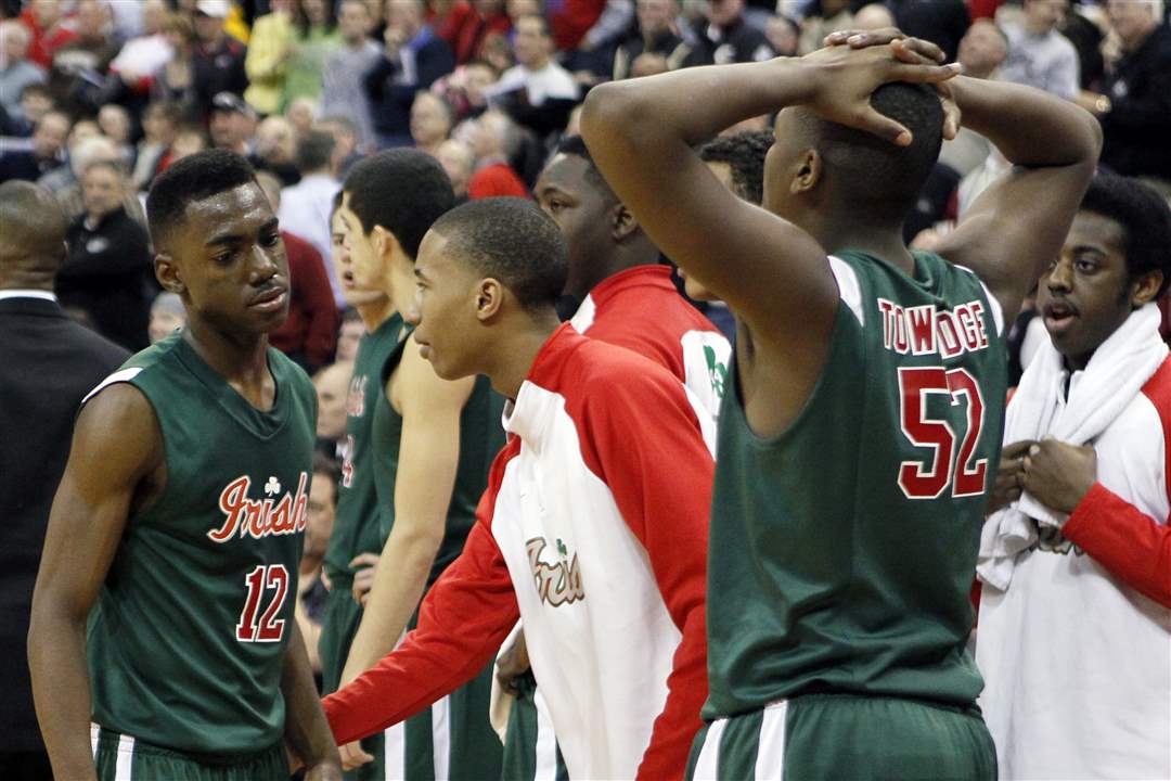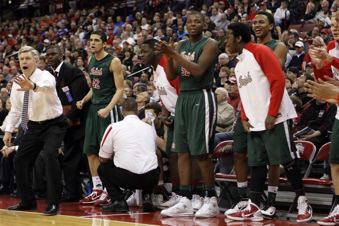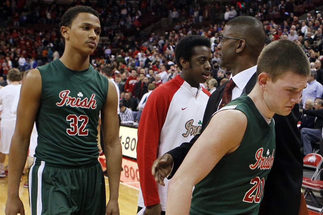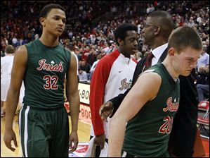 Central Catholic's Andrew Lehman (20) and Benjamin Dent (24) lead the team onto the floor against Cincinnati LaSalle during a Division I state semifinal in Columbus. The Irish lost 48-46.