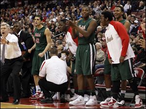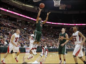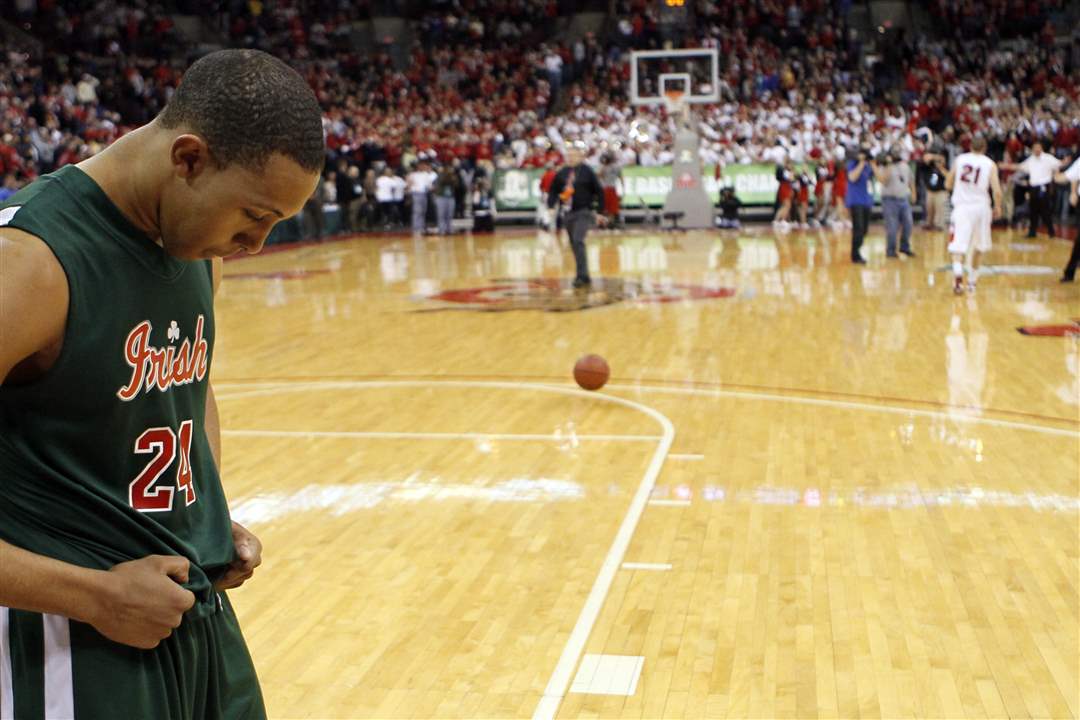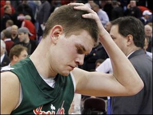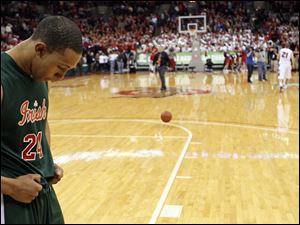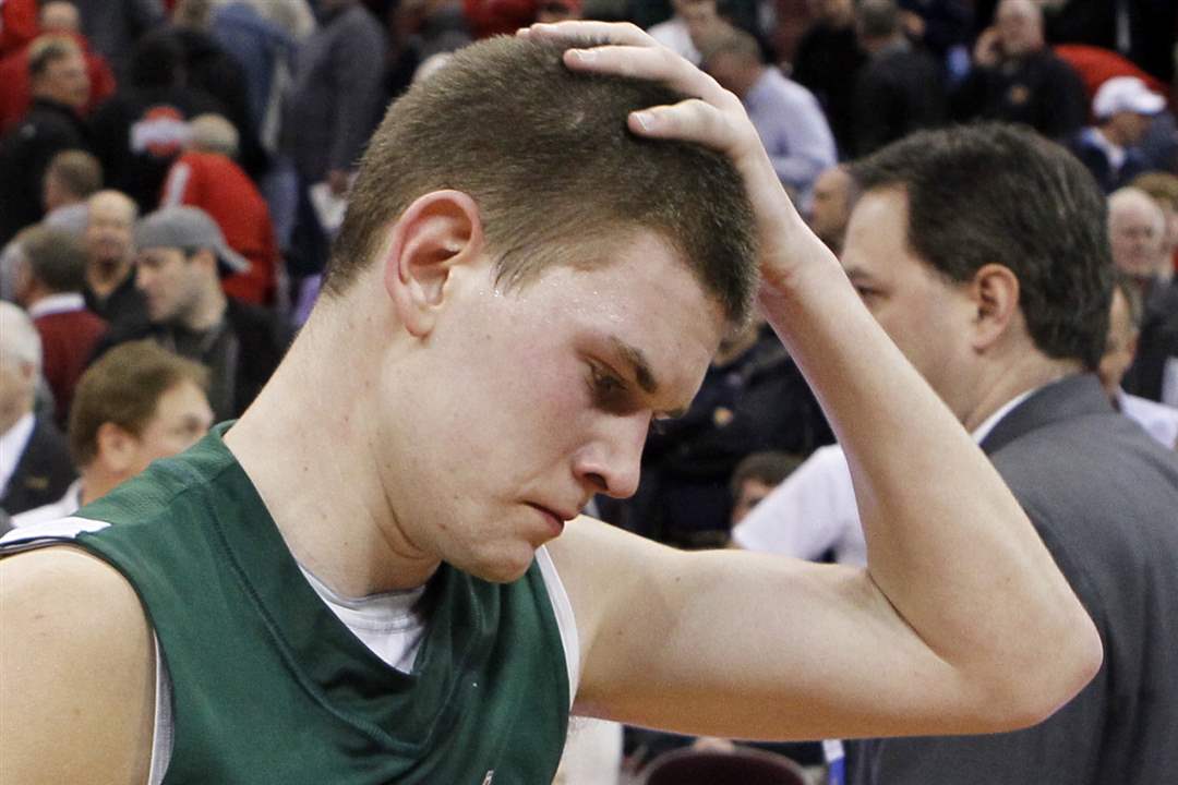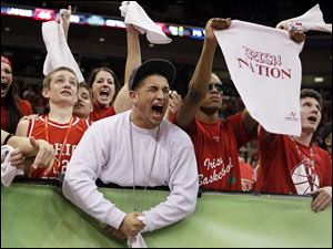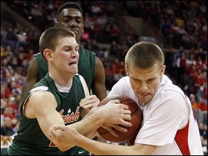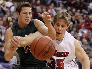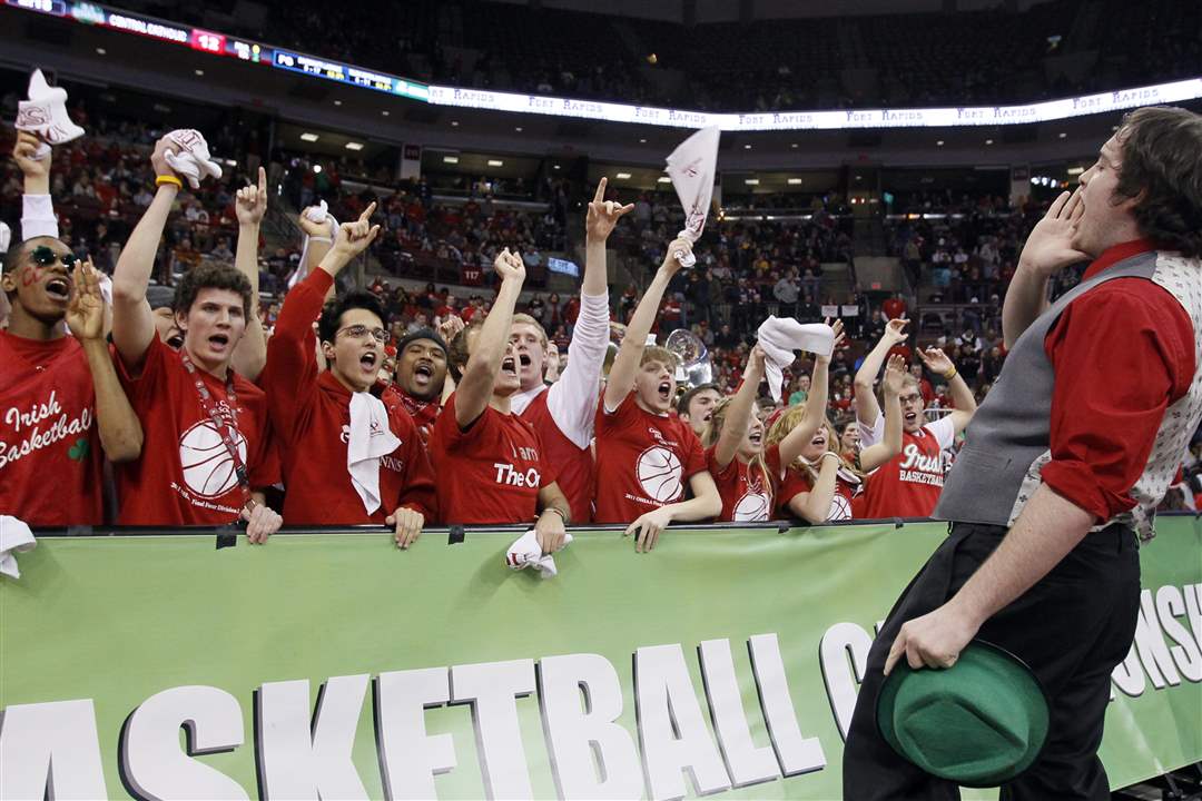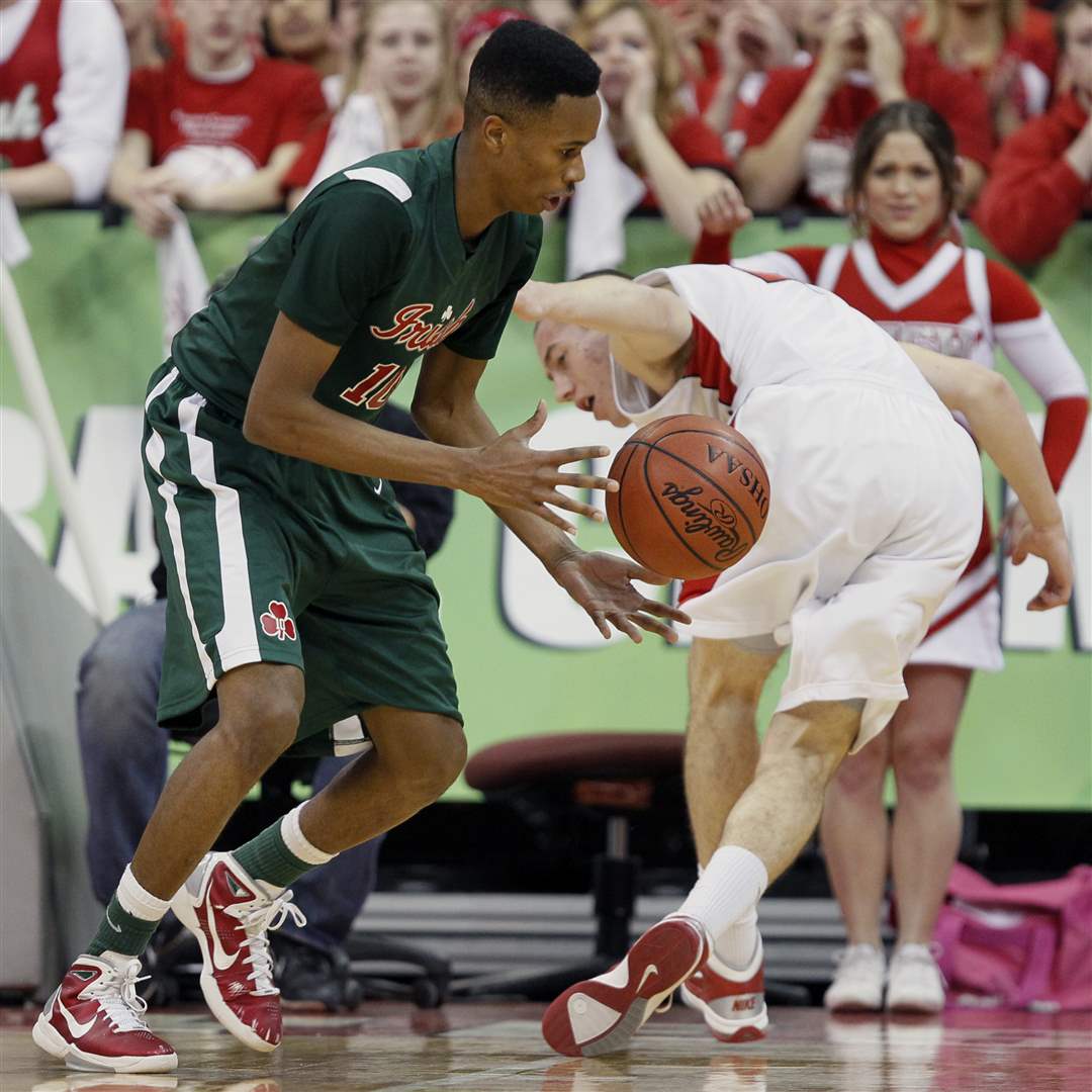 Central Catholic's Andrew Lehman (20) and Benjamin Dent (24) lead the team onto the floor against Cincinnati LaSalle during a Division I state semifinal in Columbus. The Irish lost 48-46.