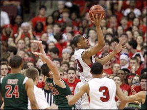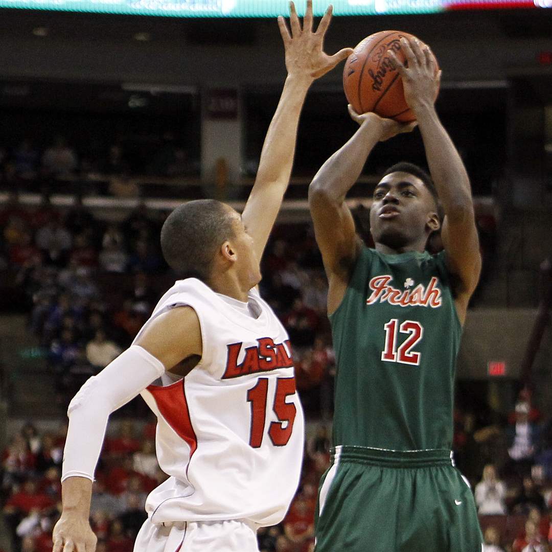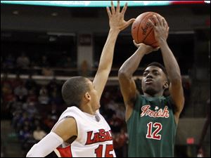 Central Catholic's Cliff Bussey (12) hits a 3-point shot against Cincinnati LaSalle's Trey Casey (15).