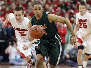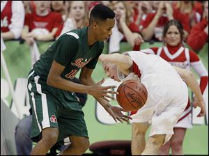 Central Catholic's Benjamin Dent (24) steals the ball fromi Cincinnati LaSalle's Kole Porter (5).
