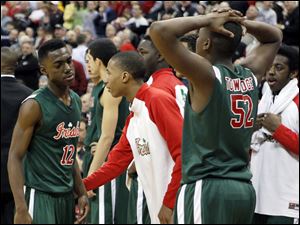 Central Catholic's Cliff Busey (12) and Keith Trowbridge are upset after losing to Cincinnati LaSalle.