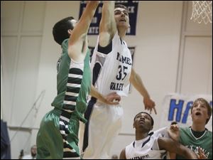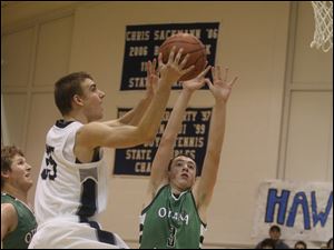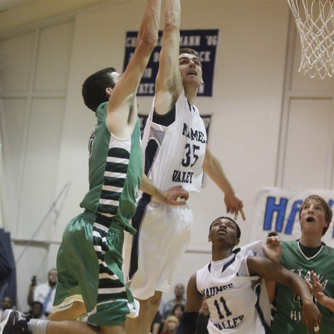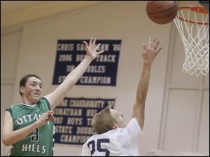 Maumee Valley's Jared Sturt, 35, scores on a jump shot as Ottawa Hills' Geoffrey Beans defends.