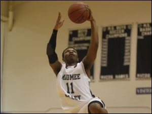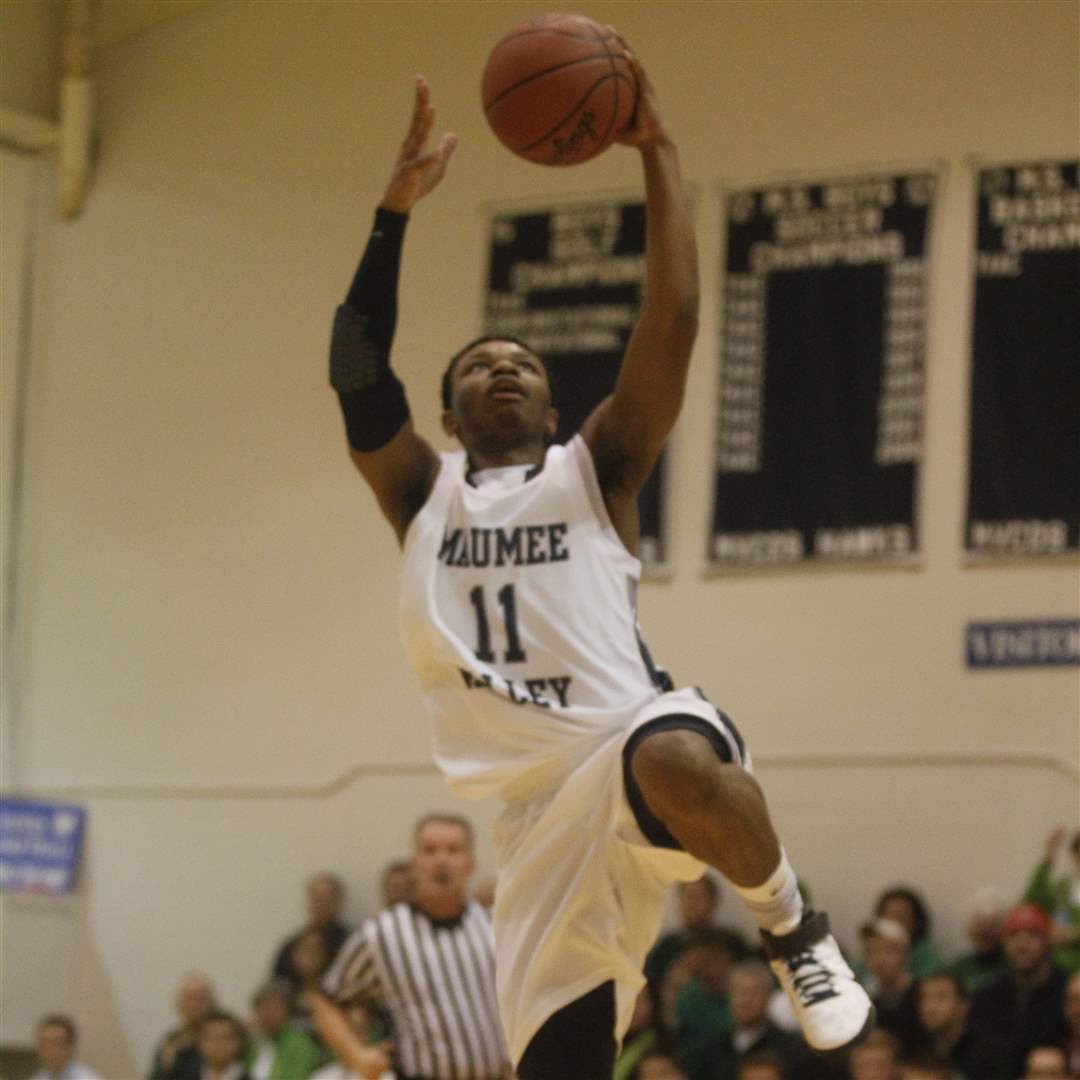 Maumee Valley guard Julius Turner makes an undefended jump shot after recovering the ball at half-court and outracing Ottawa Hills' defenders.