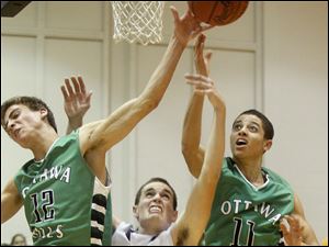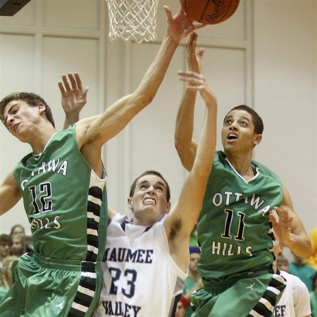 Trying to reduce a 12-point deficit, Ottawa Hills' players Max Isenberg (12) and A.J. King reach past Maumee Valley's Jonathan Krueger (23) while frantically rebounding during the final minutes of the game.