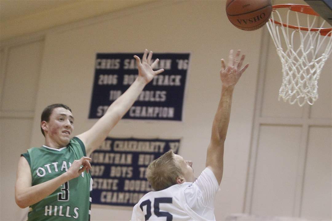Maumee Valley's Jared Sturt (35) unsuccessfully tries to block a shot by Ottawa Hills' Ian Trickey (15).