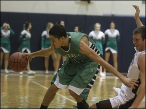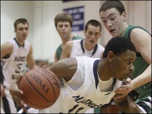 Maumee Valley's Julius Turner (11) dribbles past Ottawa Hills' Geoffrey Beans (3).