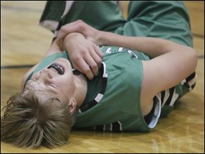 Ottawa Hills player R.J. Coil cries out in pain while holding his wrist after getting knocked to the hardwood. Coil was walked off the court, but was able to return to play later in the game.