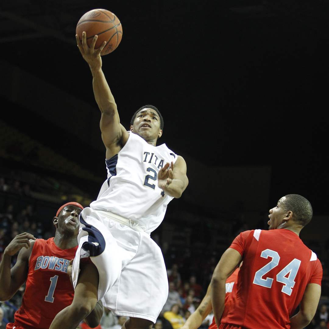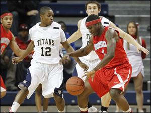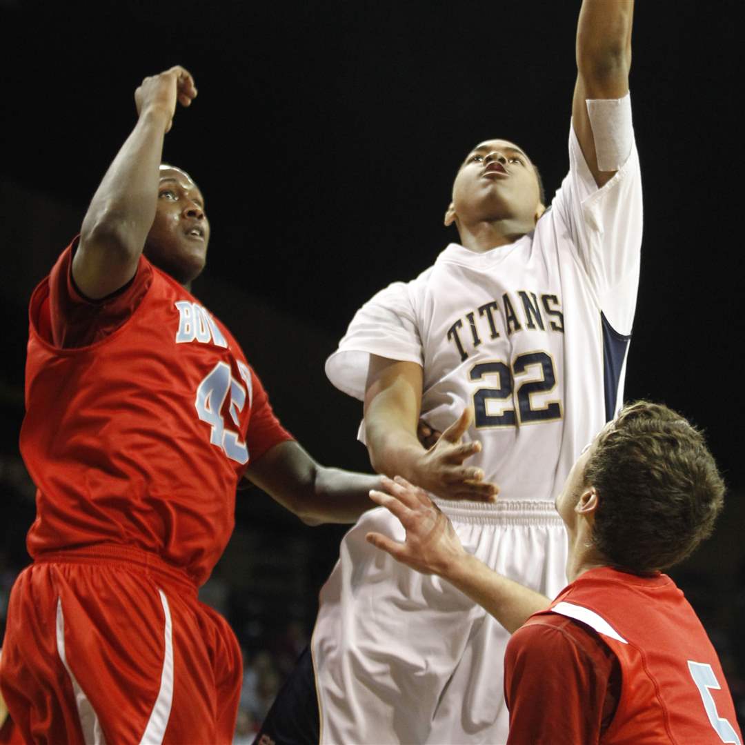 St. John's Jesuit's Jeff Copeland (22) lays up a shot against Bowsher's Maurice Birdsong (45) and Justin Neptune (5). The Titans defeated the Rebels 79-60.