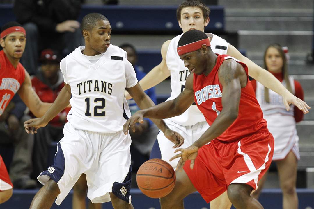 Bowsher's Robert Davis (1) tries to get past St. John's Jesuit's Tarvis Malone (12). Davis would give the Rebels 20 points.